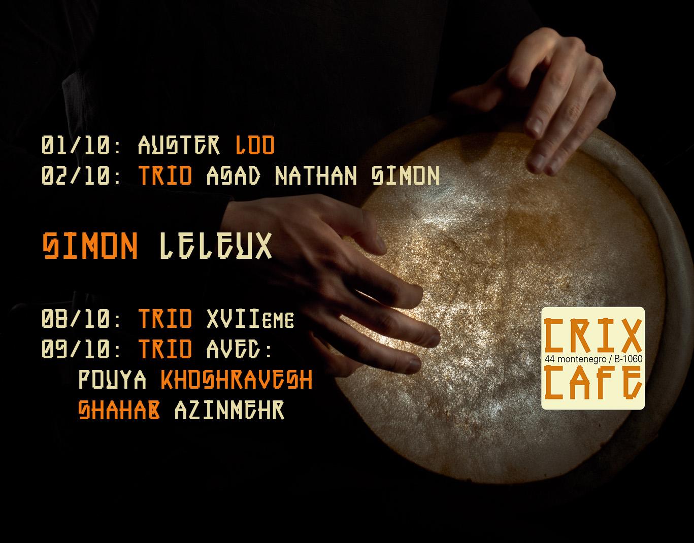 "élève du maitre de la darbuka Levent Yildirim, Simon Leleux a suivi plusieurs masterclasses avec le maitre incontesté des tambours sur cadre : Zohar Fresco. Depuis ses 10 ans, il s’est formé en percussions orientales & du Moyen-Orient"